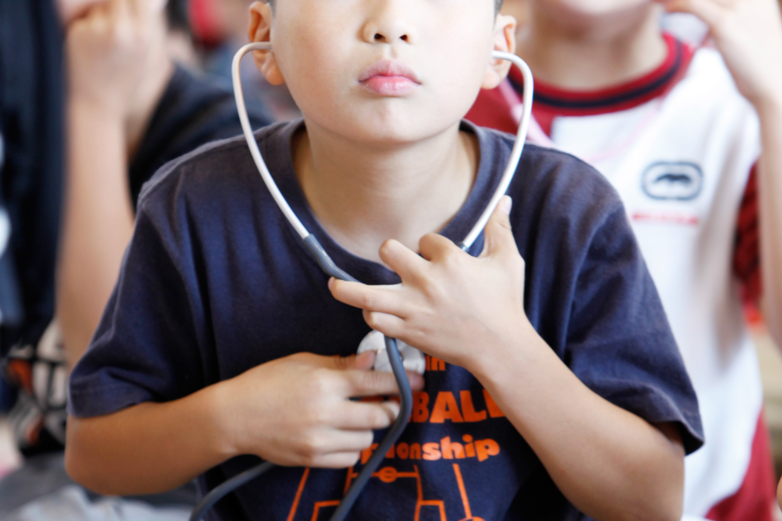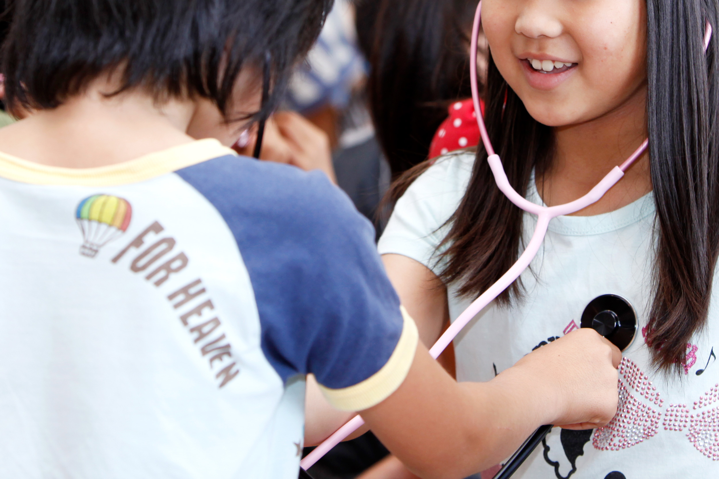 聴診器を胸にあて、自分の鼓動を聴いている様子です。「トントン トントン」という鼓動を聴く体験は、子どもたちに自分の「いのち」を再認識させてくれます。